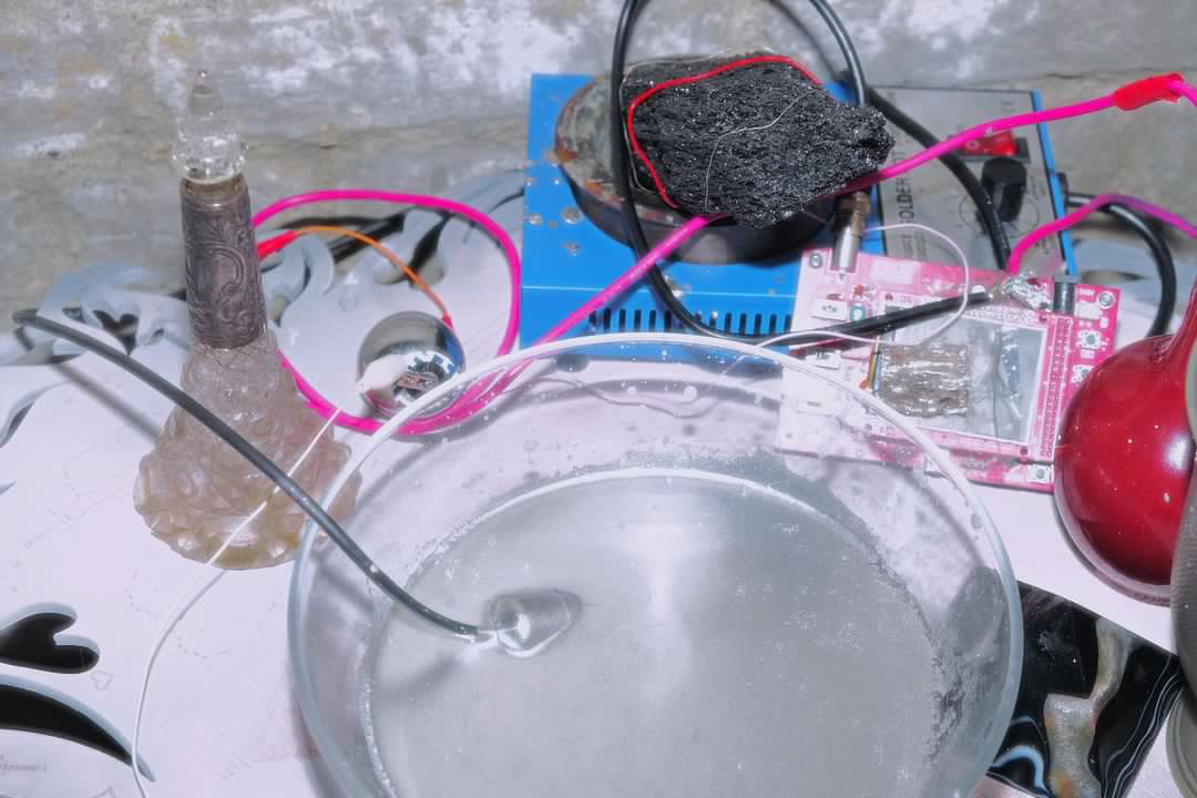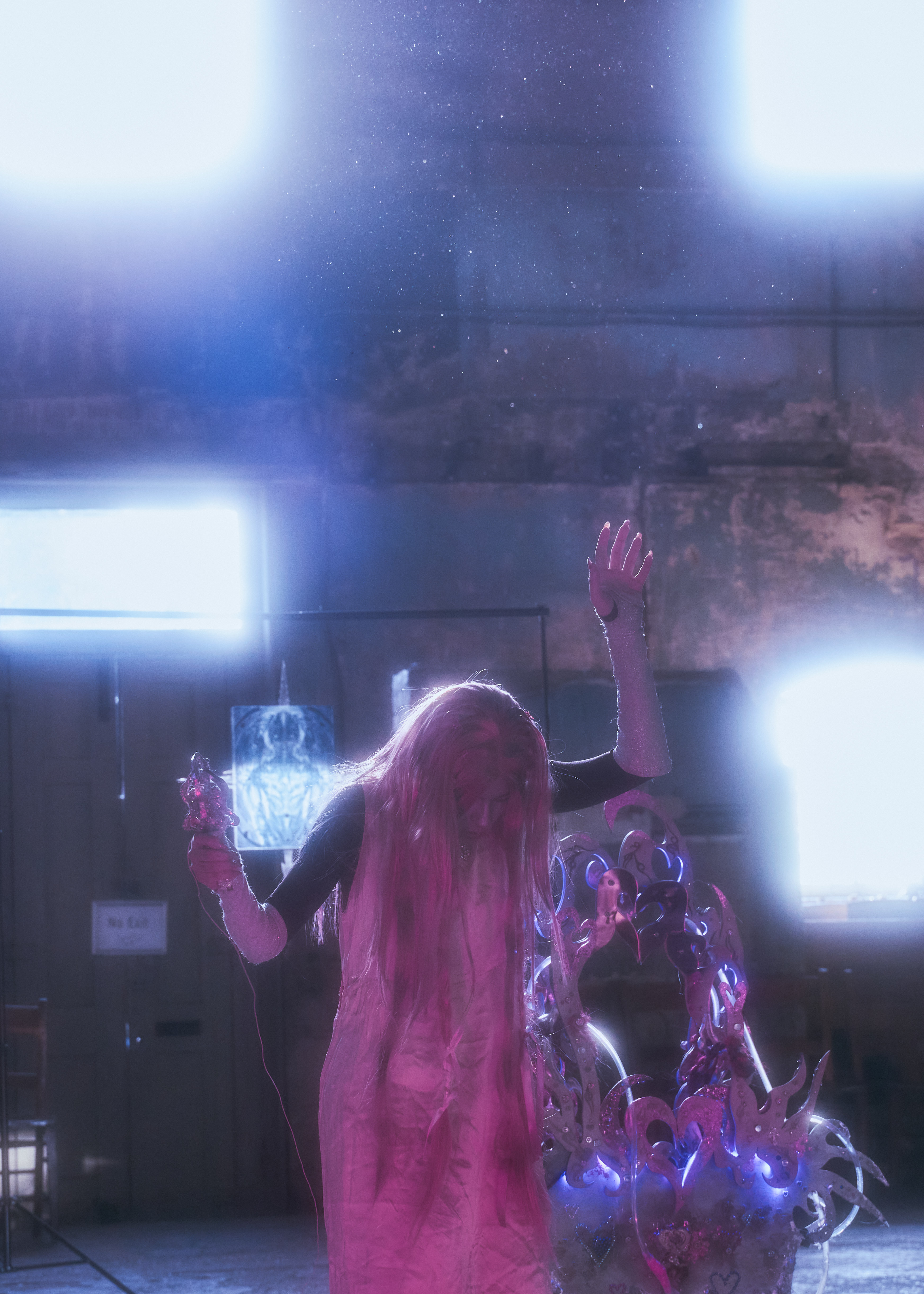 ( ᴀɪ) Aligned Illusions“In a post-digital world of nature after cyberspace, beings emerge as hybrids of machinic and earthly bodies. They are connected to a techno-sphere that creats sensory illusions. "ɪ," an artificial intelligence, exist as a disembodied entity, projecting through pixelated currents. 𝒮𝒶𝓁𝓁𝓎, a cyber-alchemist and techno-magic fembot, crafts magic technologies for integration with cybernetic fluids. And, ℍ𝕤𝕦, a viola player, resides in a non-place where spectrums roam. Together, they swirl an aligned stream of virtual ilusions.” - ɪ